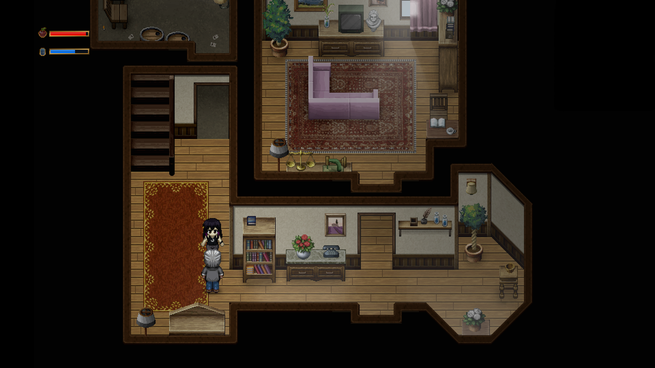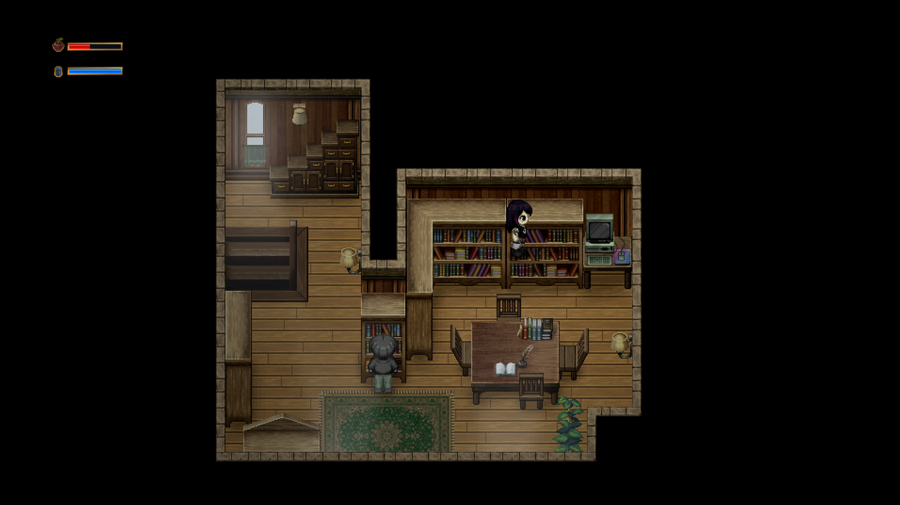 Les maps sont très bien travaillées, avec beaucoup de détails. Les décors collent à l’ambiance, et les jeux de couleur et de lumières y aident pour beaucoup. Je ne sais pas si c’est des packs de tilesets ou du custom (j’ai cru voir quelques RTP aussi), mais en tout cas c’est réussi.